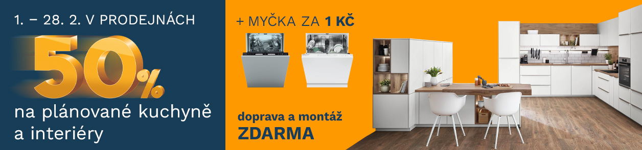 Jste připraveni na změnu? Právě teď nastal ideální čas! Máme pro vás jedinečnou akci, díky které můžete získat plánovanou kuchyni nebo interiér se slevou 50 %. Nyní navíc s dopravou a montáží zcela zdarma. A protože víme, že nová kuchyně si žádá i nové vybavení, přidáme vám k ní myčku jenom za 1 Kč.